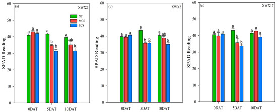 The flag leaf SPAD reading of three inbred late varieties under different temperature treatments. (a) XWX2. (b) XWX8. (c) XWX17. DAT: Days after temperature treatments; XWX2: Xiangwanxian2; XWX8: Xiangwanxian8; XWX17: Xiangwanxian17; NT: Normal temperature control; MCS: Moderate chilling stress; ECS: Extreme chilling stress. Different lowercase letters denote statistical differences among treatments of a cultivar at the 5% level according to LSD test. Error bars above mean indicate standard error (n = 3).