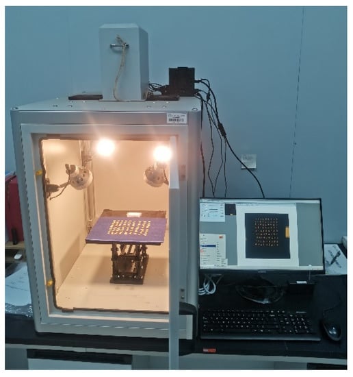 The GaiaSky-mini visible/near-infrared hyperspectral imaging system (Dualix Instruments Co., Ltd., Chengdu, China) with a spectral range of 386.7–1016.7 nm was used. As shown in Figure 1, the hyperspectral data acquisition system is fixed in a rectangular parallelepiped dark box (Sichuan Shuangli Hepu Technology Co., Ltd., HSIA-DB). The dark box includes a CCD camera (CCDSonyICX285, Tokyo, Japan) with a spectral resolution of 3 nm ± 0.5 nm; four halogen tungsten light sources; and a fixed lifting platform at the bottom of the dark box. In this experiment, the lifting platform was set prior so that the distance between the lens and the samples was 50 cm. Based on the hyperspectral imaging control software Spectral-View, the number of spectral bands was set to 256 and the imaging resolution was set as 1388 × 1392 pixels. The exposure time was 35 ms and the camera scan speed was 14 s.