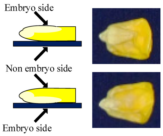 In this paper, Zhengdan 958, a corn variety with a large planting area, is the research focus. The corn seeds were purchased from Beijing Fengming Yashi Seed Company (Beijing, China) and stored in a refrigerator at the temperature 4 °C. Eighty-four corn samples were selected and had their embryonated surfaces evenly placed on the blue gauze. The hyperspectral image data of the corn seeds were collected by keeping the stalks of each seed in the same direction; the position of the seeds for image acquisition is shown in Figure 2. In this experiment, 68 samples were selected as the training set, and the remaining 16 samples were defined as the test data.