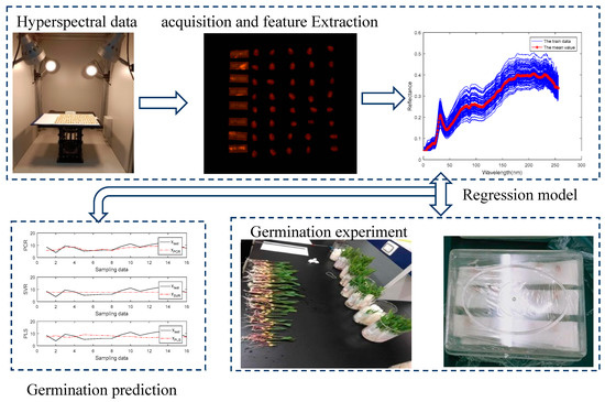 To obtain the prediction of seedling root length, the hyperspectral data of corn seeds and the corresponding germination data were used to perform data regression based on the common regression models PCR, PLS, and support vector regression (SVR) [32,33,34,35].