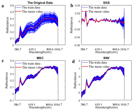 Figure 5a shows that when the spectral band changes from range 386.7 nm to 1016.7 nm, the spectral reflectance of the seeds changes discretely and dynamically. Such changes reflect the intrinsic material composition of the seed. For example, the spectral value in the 910 nm band characterizes the protein content in the sample, and the spectral value in the 660 nm band characterizes the chlorophyll a content in the sample. Therefore, the order of the spectral values with different bands cannot be exchanged. That is, when the data processing is performed, it is necessary to retain the characteristics of the dynamic correlation among different spectral bands. Traditional spectral processing methods are mainly based on the static characteristics of different spectral bands and lack the dynamic change characteristics among different bands. In particular, the commonly used hyperspectral data preprocessing methods, SGS, MSC, and SNV, may ignore such dynamic correlation features. The data distribution after data preprocessing by SGS, MSC, and SNV is shown in Figure 5b–d, respectively. It can be seen from the figure that after data preprocessing, the dynamic trend and the change of spectral reflectance among different bands will be destroyed. Thus, the spectral information that reflects the characteristics of seed vigor will be lost. In order to obtain the characteristics of the dynamic changes for the spectral data, a differential operation for the hyperspectral data to obtain the dynamic characteristics was performed. The dynamic trends of the spectral data and the data distribution, especially the extreme points, reflect the composition of the samples. Thus, both aspects of the spectral data should be extracted.