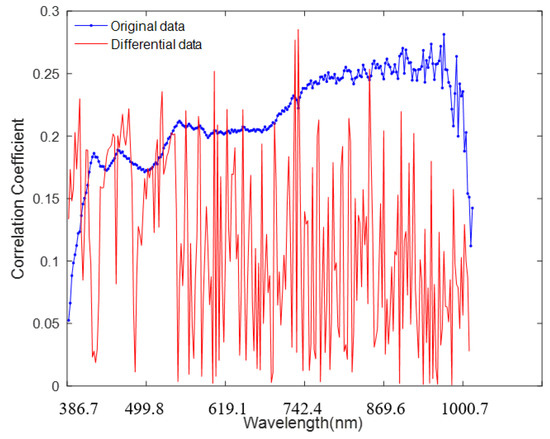 To realize the prediction of seed vigor, the spectral data of the corn seed Zhengdan 958 and its corresponding germination information were collected. According to Cui [25], the hyperspectral data of corn seeds is mainly related to the characteristics of seedling root length. Thus, in the standard germination experiment, the germination data of seedling root length were selected to reflect the germination vigor of the seeds. The original spectrum data and the corresponding first-order difference data were both used as the spectral characteristics of the corn seed. To illustrate the influence of the spectrum and its difference information on the root length prediction, Figure 6 shows the correlation coefficients of the spectrum data or the first-order differential spectrum data and the root length of the seedlings in each band.