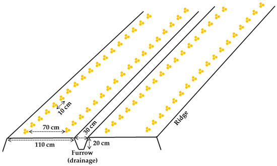 Schematic drawing of the ridges for sowing with a density of 70 cm (row space) × 10 cm (hill space) and furrow for the drainage.