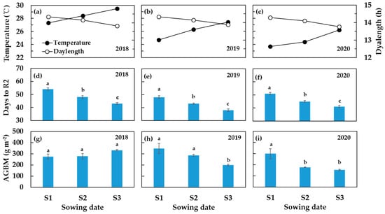 Effects of sowing dates on growth temperature (a–c), day-length (a–c), days to R2 (d–f), and aboveground biomass (AGBM) accumulation at R2 (g–i) of double-crop soybean grown in drained paddy fields over three years (2018–2020). R2 refers to flowering. S1, S2, and S3 refer to sowing date on 10–15 June, 25–30 June, and 10–15 July, respectively. Different letters above columns indicate statistically significant differences (p < 0.05). Vertical bars indicate standard errors.
