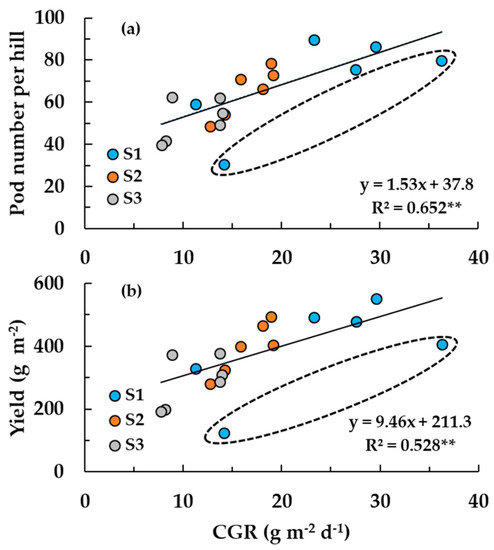 Relationships of crop growth rate (CGR) with pod number per hill (a) and yield (b). S1, S2, and S3 refer to sowing dates on 10–15 June, 25–30 June, and 10–15 July, respectively. Two dots within an ellipse with dotted line refer to data from flooded S1 plots at R2 (flowering) in 2020. ** p < 0.01.