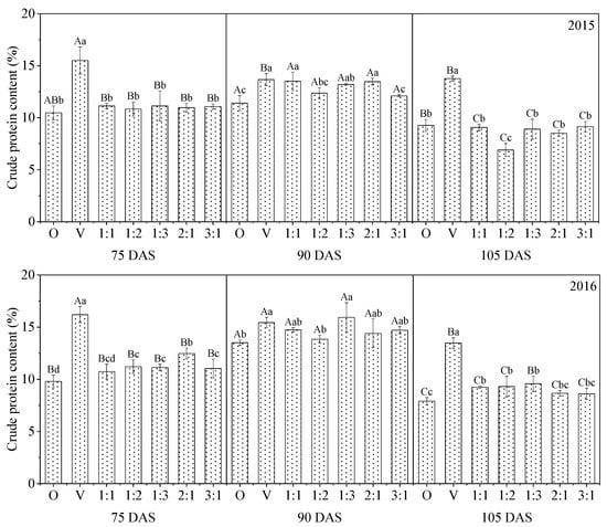 The crude protein contents in both oat and common vetch are shown in Figure 1. Crude protein concentrations from the harvested oat and common vetch were determined and expressed as percentages of dry mass (% DM) (Figure 1). CP contents were higher in sole common vetch than in sole oat. At 75, 90 and 105 DAS, the CP contents of sole common vetch were 15.5%, 13.7% and 13.8% in 2015, were 16.2%, 15.4% and 13.5% in 2016, and the monoculture common vetch showed the highest CP contents among all the treatments at 75 to 105 DAS. For the five intercrop arrangements, the CP contents were higher at 90 DAS than at 75 DAS to 105 DAS.