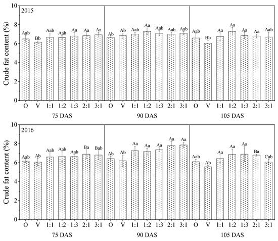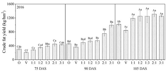 In this experiment, a similar trend to that of CP yield was observed for crude fat yield. It increased as the days after sowing increased (Figure 4). Crude fat yield analysis showed that OV3:1 was highest, at 284.53 kg·hm−2 (75 DAS), 664.69 kg·hm−2 (90 DAS) in 2015. There was a 21.7%, 73.2% and 28.8%, 55.8% increase in crude fat yield of OV3:1 mixture, respectively, as compared to sole oat and common vetch crude fat yield in 2015 and 2016. No differences between OV3:1 and OV2:1 (432.16 kg·hm−2 and 449.88 kg·hm−2 at 75 DAS in 2016, 1254.78 kg·hm−2 and 1310.88 kg·hm−2 at 105 DAS in 2016, respectively) were found (Figure 4).