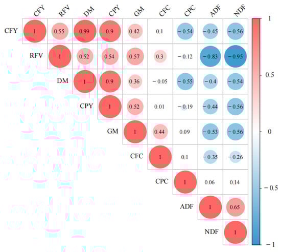 The Pearson’s correlation coefficients between forage quality and biomass were estimated (Figure 5). The results showed that dry matter was significantly related to CFY, RFV and CPY. Similarly, GM was significantly related to CFY, RFV, DM and CPY. However, CFY was only significantly related to CPC, ADF and NDF, and RFV was significantly affected by ADF and NDF.