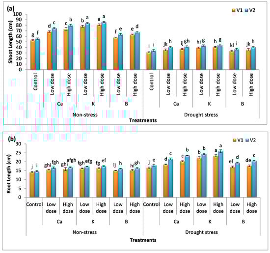 In this study, two durum wheat varieties, i.e., Preco (V1) and Kronos (V2), have been used. The data were analyzed statistically and it was observed that the application of nutrients increased the shoot length of the plants (Figure 1a–f). The percentage increase in shoot length with the low dose of Ca, K, and B was 29%, 47%, and 9% in V1 and 33%, 50%, and 13% in V2, respectively. The percentage increase in shoot length with a high dose of these nutrients was recorded as 38%, 52%, and 19% in V1 and 43%, 53%, and 21% in V2, respectively. Drought stress affects the vegetative growth of both varieties of durum wheat (Figure 1a–f). The percent decrease in plant height was 31% and 38% in V1 and V2, respectively. The exogenous application of Ca, K, and B showed ameliorative potential and enhanced plant growth significantly (p < 0.05). The percentage increase in shoot length with the application of a low dose of Ca, K, and B was 13%, 26%, and 6% in V1 and 19%, 27%, and 7% in V2 compared to untreated (drought exposed) plants. The high dose of these nutrients further increased the shoot length by 18%, 29%, and 14% in V1 and 22%, 30%, and 18% in V2, respectively, compared to their control plants. Drought stress also increased the root length of durum wheat so that the plants absorb water from deeper layers of soil. The maximum increase in root length was reported in plants receiving K as a supplement, i.e., the percentage increase was 35% and 43% with a low and high dose of K, respectively.