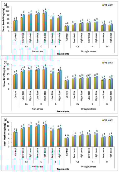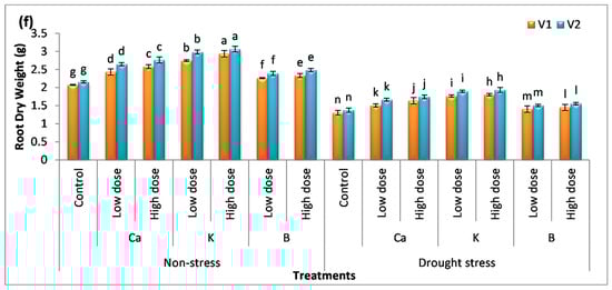 The foliar application of nutrients augmented biomass production in the plants (Figure 1c–f). An increase in the fresh weight and dry weight of the plants was observed. The analysis of data showed that the improvement in plants biomass receiving the exogenous application of nutrients was in the order of B < Ca < K. The percentage increase in the fresh weight of the shoots with the treatment of K was 70% and 76%, while root fresh weight was enhanced by 46% and 50% in V1 and V2, respectively. The increase in dry weight has also been found to be significant (p < 0.05). The use of a low dose of Ca, K, and B increases the dry weight of the shoots by 21%, 32%, and 8% in V1 and 25%, 33%, and 14% in V2, respectively. However, the application of a high dose of these nutrients increased the dry weight of the shoots by 26%, 36%, and 15% in V1 and 27%, 41%, and 22% in V2, respectively. The maximum percentage increase in the dry weight of the root was recorded with the application of K, i.e., a 41% increase in V1 and a 42% increase in V2. The analysis of data showed a significant decrease in plant biomass under drought stress compared to the control. It was observed that the application of Ca, K, and B increased the fresh weight and dry weight of plants significantly (p < 0.05). The low dose of these nutrients enhanced the fresh weight of the shoots by 26%, 56%, and 13% in V1 and 36%, 57%, and 28% in V2, whereas the percentage increase in the fresh weight of root was 20%, 34%, and 8% in V1 and 25%, 44%, and 12% in V2 compared to the (untreated) drought-exposed plants. There was a considerable difference among the means values of treatments which showed that these nutrients have different roles in plants. The percentage increase in the fresh weight of the shoots with the high dose of Ca, K, and B was 49%, 63%, and 18% in V1 and 55%, 73%, and 34% in V2. The dry weight was also analyzed and the data revealed that the use of K gave more pronounced results compared to other treatments. The increase in the dry weight of the shoots with the application of K was 30% and 36% in V1 and 32% and 40% in V2, respectively. The percentage increase in the dry weight of the roots in plants receiving the treatment of K was 30% and 38% in V1 and 37% and 40% in V2, respectively. It was also observed that the difference among the mean values of both varieties was significant. Variety V2 gave more pronounced results compared to V1.