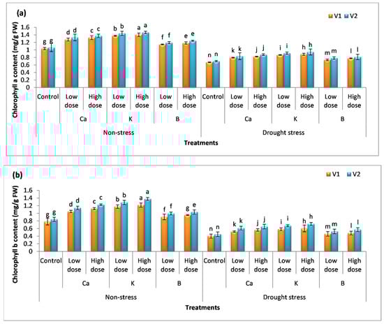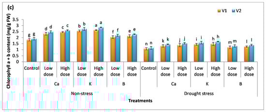 The amount of chlorophyll content indicates the photosynthetic capacity of plants. The percentage increase in chlorophyll a with the application of a low dose of Ca, K, and B was 17%, 28%, and 8% in V1 and 18%, 30%, and 11% in V2 (Figure 2a–c). The high dose increased chlorophyll a content by 22%, 31%, and 14% in V1 and 24%, 34%, and 15% in V2, respectively. It was observed that the use of K gave better results. The same trend B < Ca < K was observed in the case of chlorophyll b and chlorophyll a + b content. Drought stress decreased the amount of chlorophyll a content by 34% and 33%, while the decrease in the content of chlorophyll b was 48% and 46% compared to the control. The application of selective nutrients (Ca, K, and B) assuaged the deteriorating effects of drought stress and enhanced the amount of chlorophyll content in both varieties. The maximum increase was reported in plants treated with a high dose of K compared to other treatments, i.e., the amount of chlorophyll a, chlorophyll b, and chlorophyll a + b was augmented to 35%, 49%, and 44% in V1 and 37%, 52%, and 49 in V2 compared to the untreated (drought) plants.