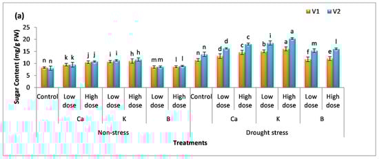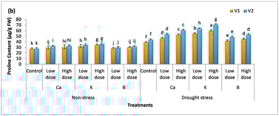 The content of proline and sugar was analyzed in plants, and it was observed that there was no significant difference among the mean values for proline content, while a significant difference was observed for the sugar content in non-stress plants compared to the control (Figure 3a,b). The percentage increase in sugar content was more pronounced in plants receiving K spray, i.e., the percentage increase was 29% (V1) and 40% (V2) with a low dose of K and 32% (V1) and 44% (V2) with a high dose. The foliar application of Ca, K, and B significantly (p < 0.05) enhanced the rate of osmolyte production in both varieties. The low dose of these nutrients increased proline content by 20%, 41%, and 8% in V1 and 22%, 45%, and 11% in V2 compared to the untreated (drought-exposed) plants, whereas the high dose of these supplements enhanced the proline content by 36%, 54%, and 36% in V1 and 39%, 62%, and 20% in V2. The data show that B < Ca < K and the same trend was observed in the case of sugar content in both varieties.