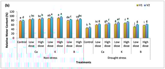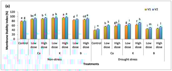 Drought stress drastically affects the membrane stability of cells and organelles as well. The integrity of the membrane is vital for the normal functioning of plants cells. In non-stressed plants, the membrane of cells was stable and the plants had enough water availability; therefore, there was no significant difference among the mean values compared to the control (Figure 4a,b). On the other hand, a decrease of 49% and 45% was observed for the membrane stability index in plants facing water stress in comparison to the control. The supplementation of Ca, K, and B reduced cell damage which indicates a high rate of membrane stability in plants. The percentage increase in membrane stability index with the low dose of these nutrients was 39%, 50%, and 13% in V1 and 41%, 54%, and 17% in V2 compared to the untreated (stress-facing) plants. The high dose of these supplements further augmented membrane stability by 46%, 60%, 18%, 51%, 67%, and 24% in V1 and V2, respectively, compared to the untreated (drought) plants.
