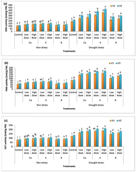 When durum wheat was subjected to water stress, the activity of antioxidants was enhanced due to the upregulation of genes responsible for the defense system in plants (Figure 5a–c). The data show that V2 has a high rate of antioxidant production compared to V1. The percentage increase in superoxide dismutase with the application of a low dose of Ca, K, and B was 41%, 76%, and 28%, while a high dose of these nutrients further augmented the superoxide dismutase activity by 53%, 95%, and 36% compared to the untreated (drought) plants. The activity of peroxidase and catalase was also increased in plants receiving the dose of these nutrients. The increase in peroxidase activity with the low dose of these nutrients was 38%, 76%, and 24% in V1 and 60%, 77%, and 36% in V2, respectively. However, the high dose enhanced peroxidase activity by 56%, 81%, and 35% in V1 and 60%, 87%, and 50% in V2, respectively, compared to the untreated (drought) plants. A similar trend B < Ca < K was observed in plants in the case of catalase activity (Figure 5c). The application of K gave a maximum activity of catalase, i.e., a 49%, 53%, 55%, and 59% increase was recorded in V1 and V2, respectively.