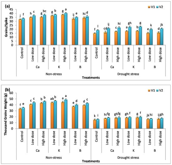Drought stress aborts ovaries and decreases the yield by reducing grain number and size (Figure 6a,b). The percentage decrease in the number of grains per spike and 1000-grain weight was 49%, 38%, 54%, and 55% in V1 and V2, respectively, compared to the control. The application of Ca, K, and B enhanced the number of grains per spike by 8%, 18%, and 3% in V1 and 13%, 21%, and 7% in V2 compared to the untreated (drought) plants. The high dose of these supplements further enhanced the number of grains per spike by 15%, 19%, and 6% in V1 and 17%, 23%, and 10% in V2, respectively. A pronounced increase in 1000-grain weight was also observed in plants receiving the application of Ca, K, and B in the direction of B < Ca < K. The maximum increase in 1000-grain weight was observed in plants receiving the high dose of K, i.e., a 24% and a 25% increase was noted in V1 and V2.