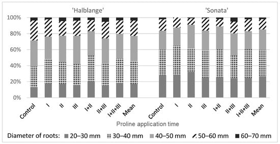 Very large roots (>70 mm in diameter) were found only in the ‘Halblange’ yield, and the use of proline contributed to a reduction in the share of such roots, excepting the application at times II + III (Figure 2).
