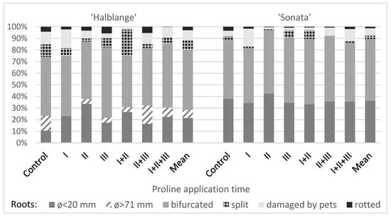 The use of proline had little effect on the share of the small roots (<20 mm) in the non-marketable yield of ‘Sonata’, which was characterized by a high share of such roots. In ‘Halblange’, the use of proline increased the share of the small roots, especially when application was carried out at BBCH 41 (Figure 2).