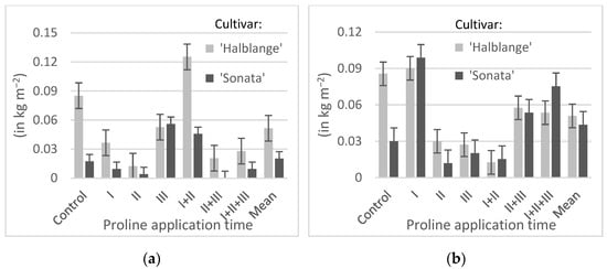 El-Sherbeny and da Silva [] found that proline increases the fresh weight of red beet leaves, but the effect depends on the level of this amino acid. In the present experiment, exogenous proline did not affect the leaf weight of the parsley compared to the control, but the time of application did. The highest leaf weight was obtained when proline was applied twice, in stages BBCH 41 and BBCH 42–43. The cultivars responded to proline to different extents, and the mean leaf weight increased in ‘Halblange’ and decreased in ‘Sonata’.