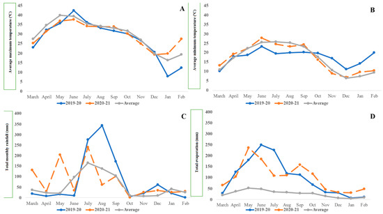 Different weather variables viz. average maximum (A) and minimum (B) air temperature, total rainfall (C), and evaporation (D) experience at Regional Research Station, Kapurthala on 2019–2020 and 2020–2021 with recorded average values from 2012.