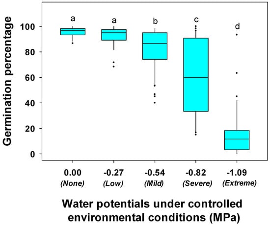 Box plot showing germination percentage of soybean genotypes under controlled environmental conditions. Germination percentage was measured at water potentials of 0.00, −0.27, −0.54, −0.82 and −1.09 MPa induced by polyethylene glycol (PEG 6000) concentrations of 0, 5, 10, 15, and 20% (w/v), respectively. In the box, the upper bound represents the 75th percentile and lower bound represents the 25th percentile. The line bisecting the box represents the median (50th percentile). The dots outside the whiskers represent the genotypes that are not within 1.5 times of the interquartile range (IQR). Different letters above bars indicate significant differences among treatments at α = 0.05.