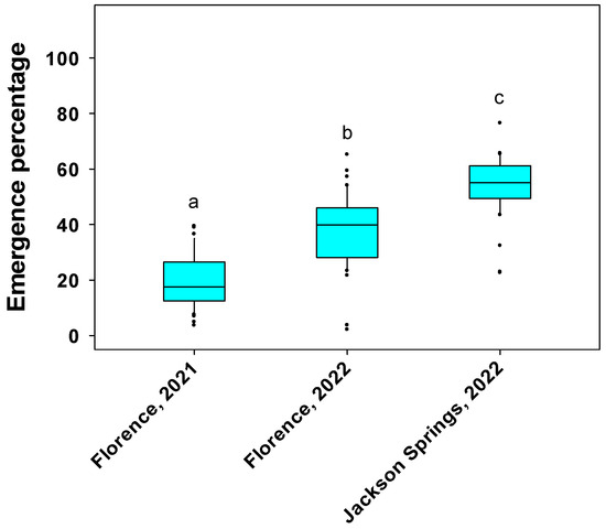 Box plot showing emergence percentage of soybean genotypes at Florence, SC in 2021 and 2022 and Jackson Springs, NC in 2022. Emergence percentage was recorded at 7 d after planting. In the box, the upper bound represents the 75th percentile and lower bound represents the 25th percentile. The line bisecting the box represents the median (50th percentile). The dots outside the whiskers represent the genotypes that are not within 1.5 times of the interquartile range (IQR). Different letters above bars indicate significant differences among environments at α = 0.05.