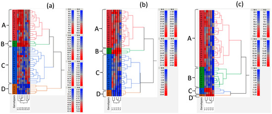 Dendrograms showing Ward’s hierarchical clustering of soybean genotypes based on germination/emergence percentage (a); germination index (b); and germination potential (c). The genotypes were grouped into four distinct clusters: A through D. Labels V-1 through V-5 indicate germination percentage (a), germination index (b), or germination potential (c) at water potentials of 0.00, −0.27, −0.54, −0.82 and −1.09 MPa, respectively, under controlled environmental conditions. Labels V-6, V-7, and V-8 indicate emergence percentages measured at Florence, SC in 2021; Florence, SC in 2022; and Jackson Springs, NC in 2022, respectively. Genotypes 1–41 are marked on the dendrograms; e.g., # 7 indicates PI 398237, # 12, PI 398532; # 13, PI 398566; # 14, PI 398704; # 22, PI 408169D: # 23, PI 408175, # 30, PI 424605A; and # 39, PI 603171. Please see Table S1 for other genotype names corresponding to the numbers. The color bars right to the dendrograms represent values for the traits presented in the dendrograms, with colors changing from blue (lowest) to red (highest).