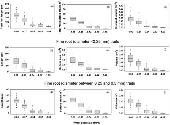 (a–i) Box plot showing root traits of soybean genotypes at different water potentials. Under controlled environmental conditions, plants were hydroponically grown at five different water potentials [0.00 MPa (no water stress), −0.27 MPa (low water stress), −0.54 MPa (mild water stress), −0.82 MPa (severe water stress), and −1.09 MPa (extreme water stress)] and root traits were measure at 14 days after sowing.