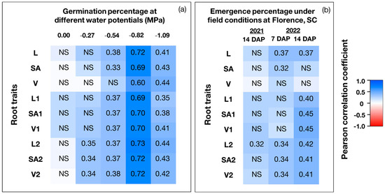 Heatmap representing the correlation between root morphological traits and germination percentage under controlled environmental conditions (a), and between root morphological traits and emergence percentage under field conditions (b). Under controlled environmental conditions, plants were grown at five different water potentials (0.00 MPa (no water stress), −0.27 MPa (low water stress), −0.54 MPa (mild water stress), −0.82 MPa (severe water stress), and −1.09 MPa (extreme water stress)). The value in each cell represents the Pearson correlation coefficient (r). DAP = Days after planting; NS = Not significant at α = 0.05. L = Total root length (cm); SA =Total root surface area (cm2); V = Total root volume (cm3); L1 = Length of fine roots with diameter <0.25 mm (cm); SA1 = Surface area of fine roots with diameter <0.25 mm (cm2); V1 = Volume of fine roots with diameter <0.25 mm (cm3); L2 = Length of fine roots with diameter between 0.25 and 0.5 mm (cm); SA2 = Surface area of fine roots with diameter between 0.25 and 0.5 mm (cm2); V2 = Volume of fine roots with diameter between 0.25 and 0.5 mm (cm3).