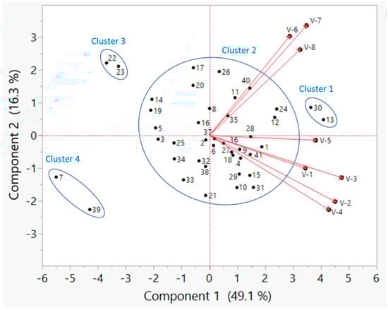 Principal component analysis biplot demonstrating clustering of soybean genotypes based on germination percentage under controlled environmental conditions and emergence percentage under field conditions. Vectors V-1 through V-5 indicate germination percentage at water potentials of 0.00, −0.27, −0.54, −0.82 and −1.09 MPa, respectively, under controlled environmental conditions. Vectors V-6, V-7, and V-8 indicate emergence percentages measured at Florence, SC in 2021; Florence, SC in 2022; and Jackson Springs, NC in 2022, respectively. Genotypes 1–41 are marked on the biplot; e.g., # 13 indicates PI 398566; # 30, PI 424605A; # 7, PI 398237; and # 39, PI 603171. Please see Table S1 for other genotype names corresponding to the numbers.