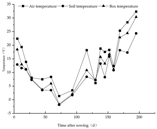 The frequency of air intake in the seedling stage (5 to130 days after sowing) was 7 days, the frequency of air intake in the middle stage (138 to 169 days after sowing) was 7 days, and the frequency of air intake in the later stage (181 to 195 days after sowing) was 14 days. At the same time, a plug-in temperature sensor was used to measure the soil temperature at 10 cm depth, the box temperature and the atmospheric temperature (see Figure 1). After sampling, the static box was removed to minimize the impact of the box on the crop and soil environment.