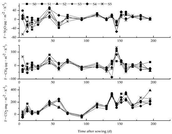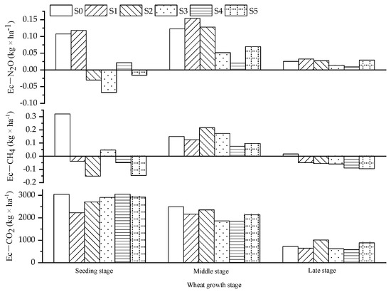 The cumulative N2O emissions in the S0, S1 and S4 treatments were concentrated in the seedling stage, and the cumulative N2O emissions in the S2, S3 and S5 treatments were concentrated in the middle stage. At the seedling stage of wheat, the cumulative CH4 emission range of in each fertilization treatment was −0.15 to 0.32 kg × ha−1, and the order of magnitude was S0 > S3 > S1 > S4 > S5 > S2. In the middle stage of wheat, the cumulative CH4 emission range in each fertilization treatment was 0.08 to 0.22 kg × ha−1, and the order of magnitude was S2 > S3 > S0 > S1 > S5 > S4. In the later stage of wheat, the cumulative CH4 emission range in each fertilization treatment was −0.10 to 0.02 kg × ha−1, and the order of magnitude was S0 > S1 > S2 > S3 > S4 > S5.