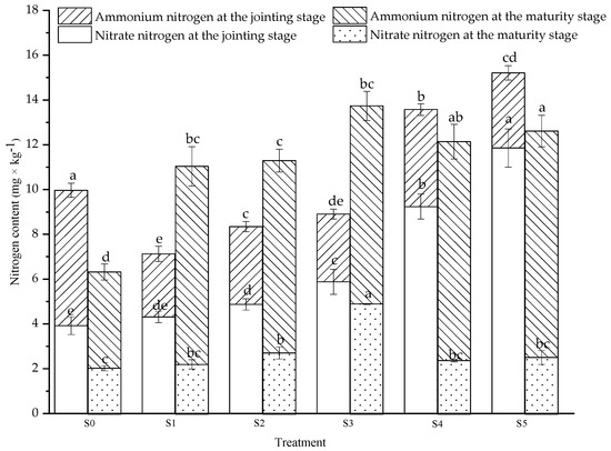 To clarify the effect of composted sewage sludge replacement of nitrogen fertilizer on soil available nitrogen, the contents of soil ammonium nitrogen and nitrate nitrogen were analyzed at the joining stage and maturity stage (Figure 4). At the jointing stage of wheat, the soil nitrate nitrogen content increased with the increase in the ratio of sludge replacing nitrogen fertilizer, and compared with that of the S0 treatment, the nitrate nitrogen contents of the S2, S3, S4 and S5 treatments were significantly increased by 24.23% to 202.30%.