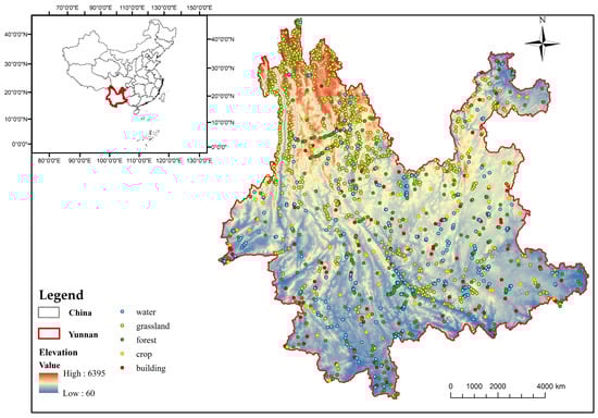 A total of 1770 sample points, including 722 grassland sample points, were collected for the classification and accuracy verification of the grasslands (Figure 1). The sample points were selected based on a field survey and the 2019 Yunnan Grassland Monitoring Sample Sites; 318 points were verified on the field research. The distance between the two sample points exceeded 10 m, and the points were well distributed in the natural grassland. At each point, 10 m × 10 m quadrats were established, and the location (GPS coordinates), elevation, slope, aspect, grassland type, and dominant grass species were recorded; some studies obtain relevant data from existing databases or government [37]; thus the rest of the sample sites are from the 2019 Yunnan Grassland Field Monitoring Sample Sites from the Yunnan Provincial Forestry and Grassland Bureau (http://lcj.yn.gov.cn/, accessed on 1 March 2020). We used the National Remote Sensing Monitoring Land Use/Cover Classification System to classify the land cover in Yunnan into five categories: grassland, cropland, forest, water, and building. Finally, 70% of the samples were randomly selected as the training dataset to establish the classification model, and 30% were selected as the validation dataset to evaluate the accuracy of the model.