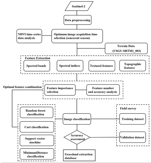 The flowchart of the study is shown in Figure 2. The grassland classification includes four key steps. The feature importance was determined in the Python platform, and the other steps were implemented in the GEE platform.