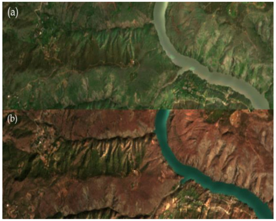 (a,b) shows the comparison of Sentinel-2 images in visible bands during the (a) growing season and (b) senescent season.