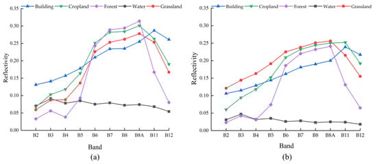 (a,b) shows comparison of the band reflectance of different classes during the (a) growing season and (b) senescent season.
