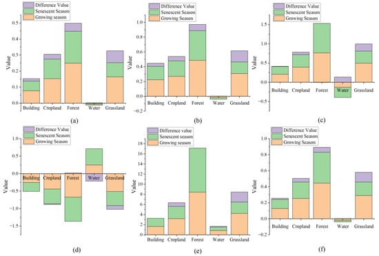 (a–f) shows the values of different vegetation indices ((a) DVI, (b) EVI, (c) NDVI, (d) NDWI, (e) RVI, (f) MSAVI ) in the two seasons and their difference.