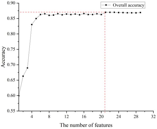 Twenty-nine features were used for RFE; the results are shown in Figure 7. The classification accuracy increased rapidly in the early stage with an increase in the number of features, followed by a small fluctuation in classification accuracy. As the number of features with low relevance increased, information redundancy occurred, resulting in a decrease in accuracy. The classification accuracy reached its maximum value at 21 features during the optimal phenological period. Thus, this feature combination was used for classification (Table 2).