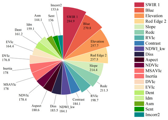 Four spectral bands, six vegetation indices, fifteen texture features, and four topographic features were used in the RF model. The relative importance scores of the variables were calculated, describing the variable’s contribution to the classification (Figure 8). Due to the randomness of the feature importance scores obtained from the RF algorithm, different feature importance scores were obtained from each calculation. Three iterations of the importance score calculations are performed to reduce the error due to randomness. The variable with the highest relative importance for grassland extraction is SWIR1. This result is consistent with the results of Abdi et al. (2022) [16]. The topographic feature with the highest relative importance is elevation [30], and the variable with the lowest importance is Imcorr2 (133.6) (Figure 8).