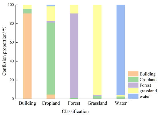 The optimal feature combination was input into the RF classifier in the GEE platform to classify the five land types in the study area. The OA of the RF classification is 91.2%, with a kappa coefficient of 0.887 (Table 4).