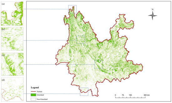 The grassland distribution in Yunnan province in 2019. (a–d) represent Diqing city, Dali city, Yuanjiang River, and Xishuangbanna prefecture.