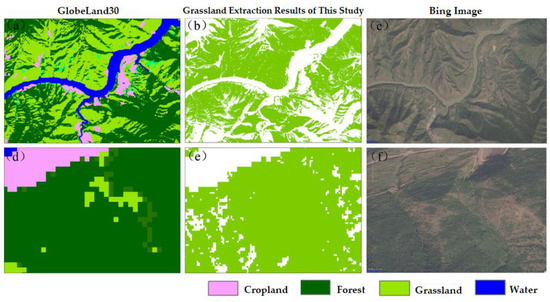 Comparison of grassland extraction results using GlobeLand30 (a,d) and the proposed method (b,e), and Bing images (c,f) in Central Jinsha River, Huaping County.