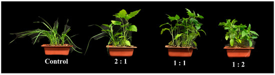 The total number of Solanum carolinens:Festuca arundinaceae seeds were sown, at a ratio of (So:Fe; 20:10, 10:10, and 10:20), into a pot (140 mm × 90 mm × 50 mm). The experiment was conducted in a greenhouse with temperature of 27 ± 4 °C and relative humidity 60~70%. Four weeks after sowing, a growth survey was conducted on plant height, root length, and fresh weight, and the sample was stored in an oven at 70 °C for 48 h to measure dry weight.