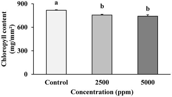 Effect of SCE treatment on chlorophyll content of Festuca arundinacea. Error bars represent standard deviations. Each data point represents the mean of at least six replications. Bars with different letters are significantly different from each other at p ≤ 0.05.