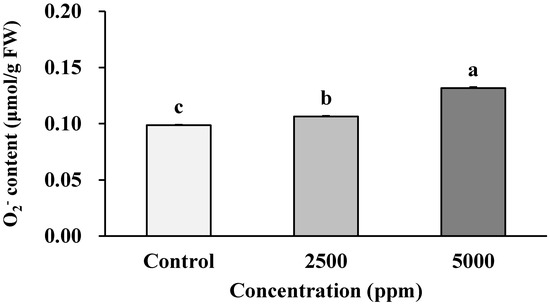 Effect of SCE treatment on the O2− content of Festuca arundinacea. Error bars represent standard deviations. Each data point represents the mean of at least eight replications. Bars with different letters are significantly different from each other at p ≤ 0.05.
