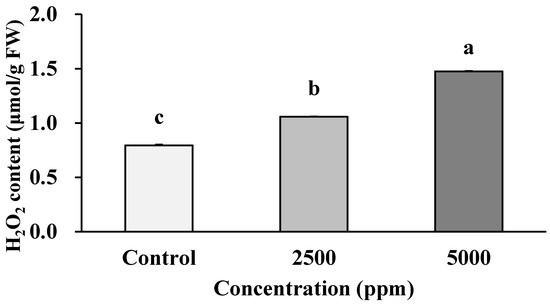 Effect of SCE treatment on H2O2 content of Festuca arundinacea. Error bars represent standard deviations. Each data point represents the mean of at least six replications. Bars with different letters are significantly different from each other at p ≤ 0.05.
