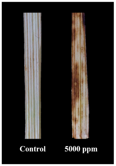 ROS act as signaling molecules regulating plant responses to biotic and abiotic stresses [37,38]. In our study, the crude extract treatments at 2500 and 5000 ppm significantly increased the Superoxide anion radical (O2−) content by 7.8% and 33.4%, respectively (Figure 6); similarly, the H2O2 content significantly increased to 33.3% and 85.8% (Figure 7). Moreover, the visual evaluation of H2O2 was observed after processing 5000 ppm of SCE in Festuca arundinacea using the DAB staining method. It was visually confirmed that the H2O2 content of the Festuca arundinacea leaves treated with the SCE was increased (Figure 8). The ROS radicals generate lipid peroxide, affect membrane permeability, and degrade DNA and proteins. Allelochemicals also depolarize the cell membrane, causing cellular disruption and cell death. Although all organisms require an appropriate level of ROS concentration, an excessive accumulation of ROS in plants can destroy chlorophyll and affect root development [39,40]. Based on these results, we can conclude that allelochemicals in the SCE induce detrimental effects in Festuca arundinacea.
