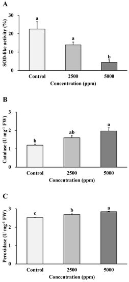 Effect of SCE treatment on the antioxidant content of Festuca arundinacea (A) SOD, (B) CAT, and (C) POD. Error bars represent standard deviations. Each data point represents the mean of at least six replications. Bars with different letters are significantly different from each other at p ≤ 0.05.