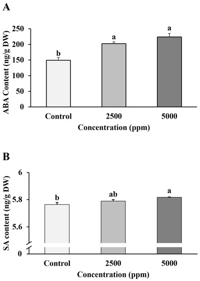 Effect of SCE treatment on abscisic acid (ABA) and salicylic acid (SA) content of Festuca arundinacea. Error bars represent standard deviations. Each data point represents the mean of at least three replications. Bars with different letters are significantly different from each other at p ≤ 0.05.
