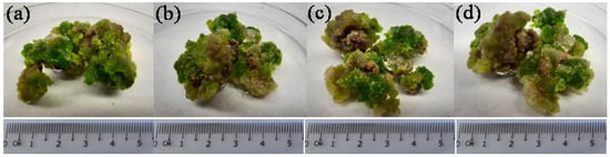 Induced calli from the explants of stevia at 30 DACI; (a) induced callus on MS media with 0.10 mg/L 2, 4-D and 0.10 mg/L zeatin; (b) induced callus on MS media with 0.50 mg/L 2, 4-D and 0.10 mg/L zeatin; (c) induced callus on MS media with 1.00 mg/L 2, 4-D and 0.10 mg/L zeatin; and (d) induced callus on MS media with 1.50 mg/L 2, 4-D and 0.10 mg/L zeatin.